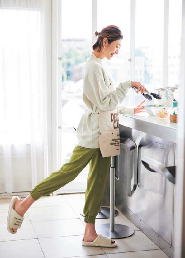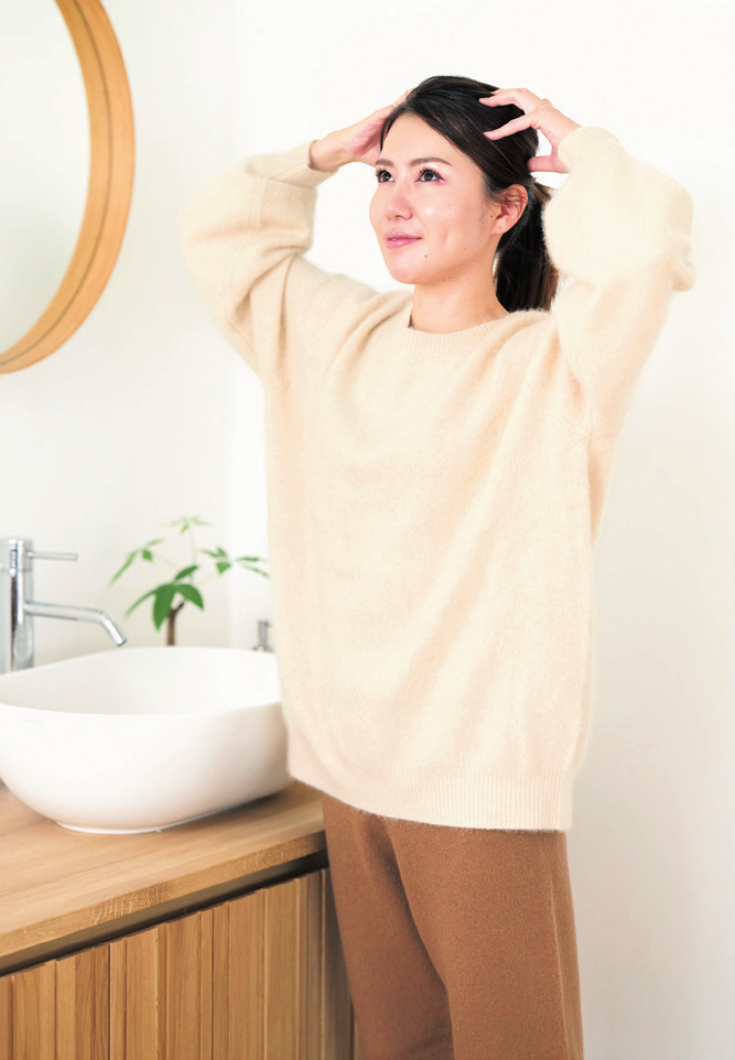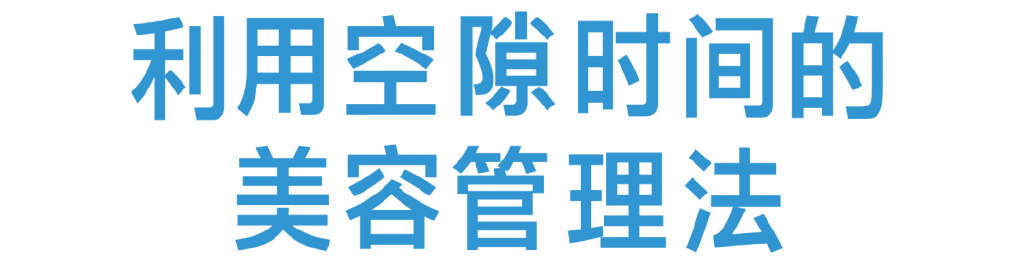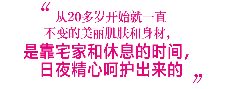 家里有孩子后,当妈妈的会忙得几乎没有时间,所以我会在出行、化 妆、拍摄的间隙做好美容功课,还会和化妆师交换美容信息,学习新知 识。然后就是洗完澡后的时间。我洗完澡后花费的护肤时间要比洗澡的时间还长,会一边敷面膜一边慢慢地涂上按摩霜,在浴室谁都不会过来看你在干嘛,所以可以让人专心护肤。这是我一直保坚持的习惯。